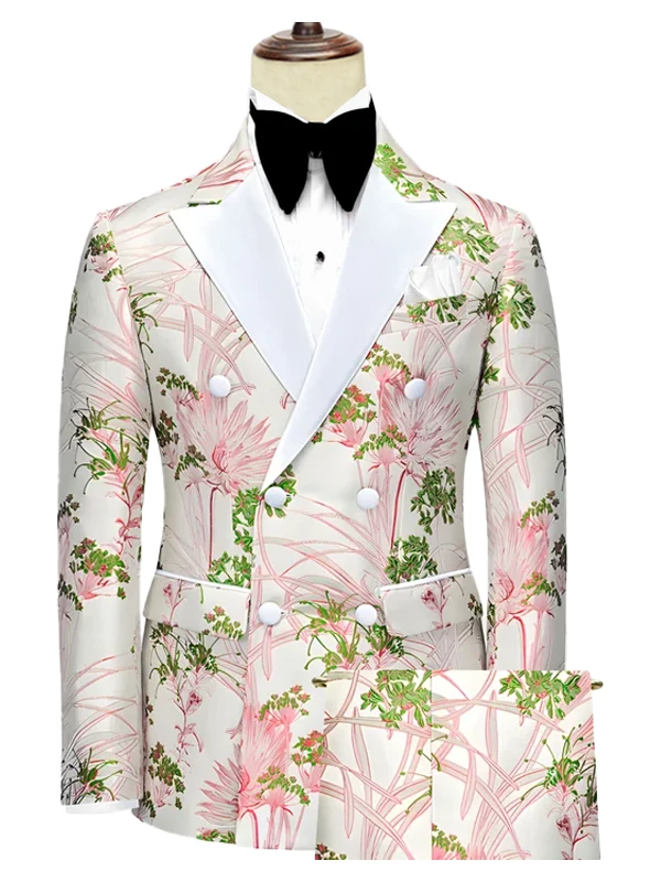 Elegant and Stylish Custom Made Three Piece Shawl Lapel Single Breasted White Botanical Floral Jacquard Men Tuxedo