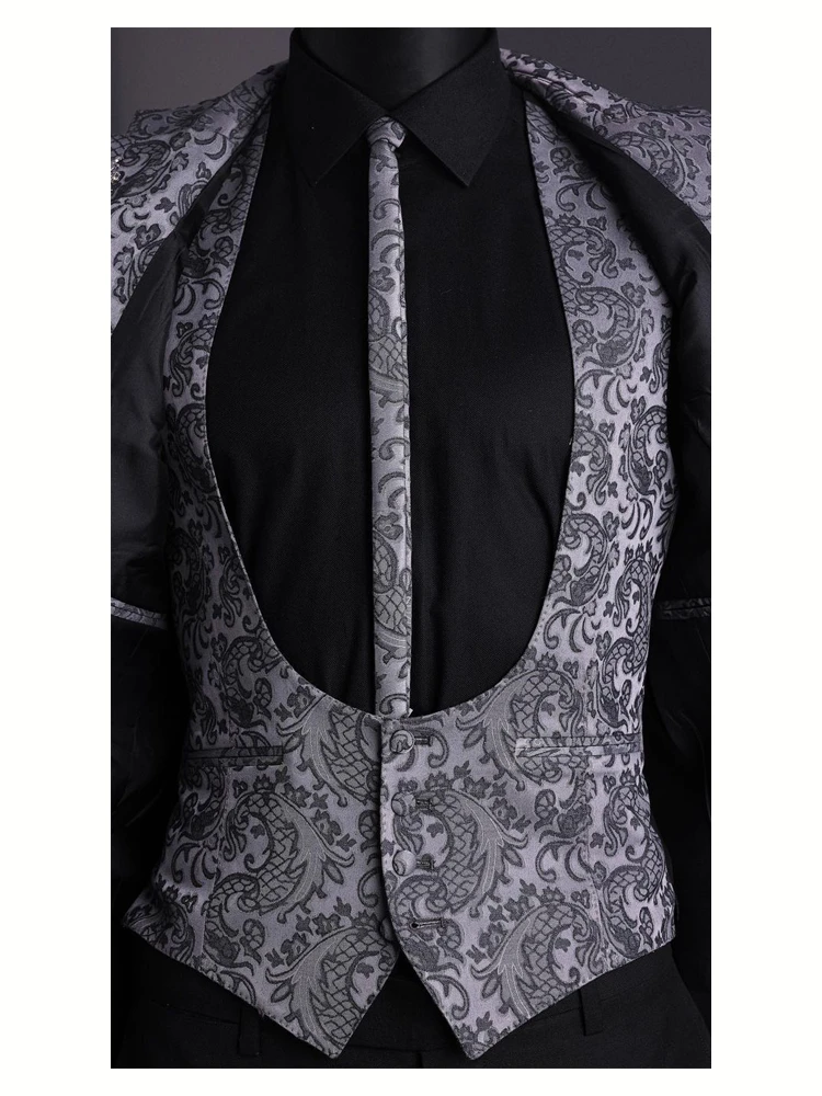 Chic and Gorgeous Custom Made Three Piece Notch Lapel Single Breasted Grey Jacquard Wedding and Prom Tuxedo