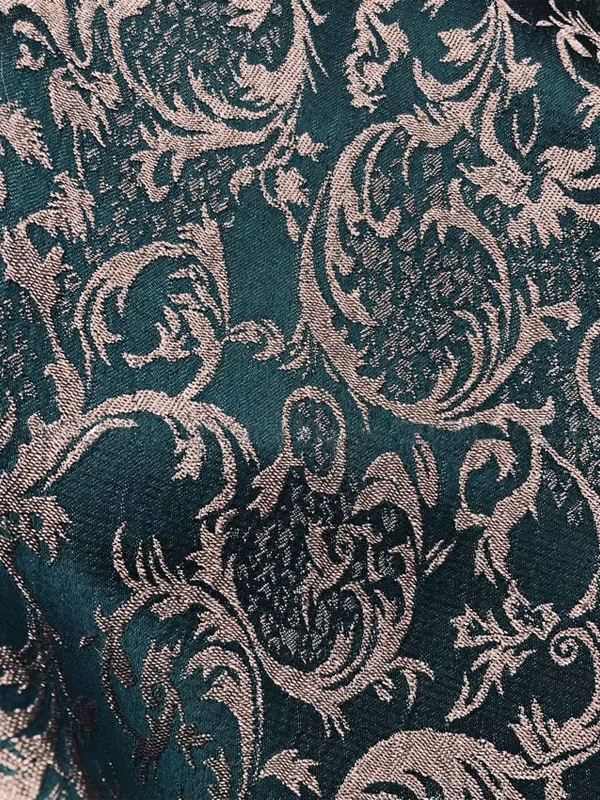 • The fabric utilizes high-quality polyester, offering a rich emerald green base with a silky sheen. The centerpiece is the classic European jacquard pattern—intricate, symmetrical golden scrollwork that exudes luxury and elegance. The silhouette features a modern slim-fit cut for a sharp, structured look. Paired with a matte satin shawl collar and a matching jacquard cummerbund, the ensemble achieves a balance of opulence and sophistication, fully showcasing gentlemanly charm.