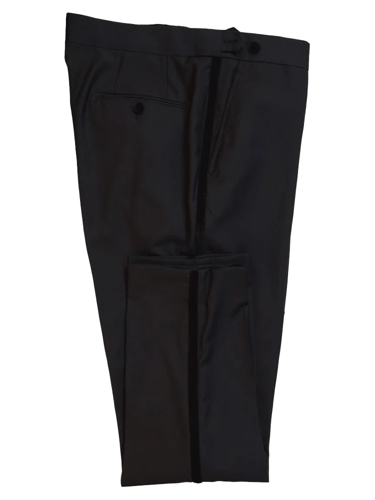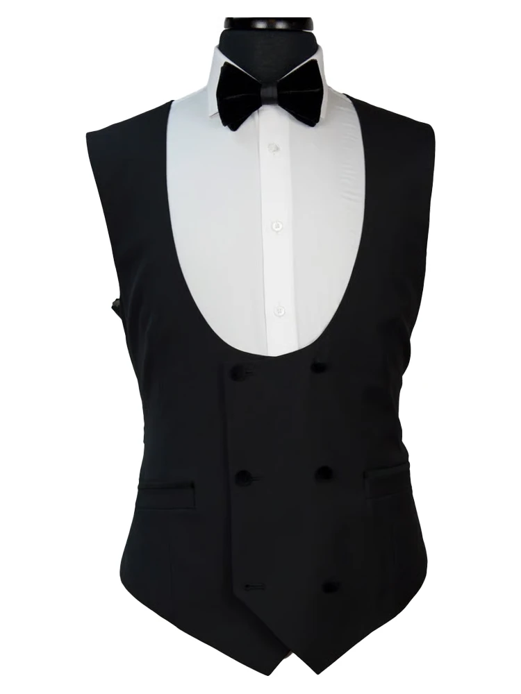 • If you’re in the market for our classic black tuxedo, this is an excellent option. Everyone needs a black tuxedo – whether for weddings or events. Definitely an essential for any man’s wardrobe. This version in the shop is special with a low cut double breasted vest and velvet lapels/pocket trim/chest pocket/buttons.