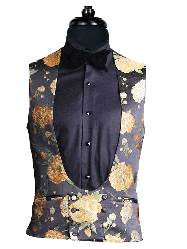 • Jacket: Velvet Peak Lapel; Single Breasted One Button Closure; Two Flap Pockets; Ticket Pocket; Double Vents; Welted Chest Pocket; Full Lining. Trouser: Same Fabric with Jacket; Flat front; Belt Loops; 2 Jetted Hip Pockets; 2 Slant Front Pockets; Zip Closure. Waistcoat: no Lapel; Double Breasted 8 Button Closure with Black Satin Trim; 2 Besom Front Pockets.