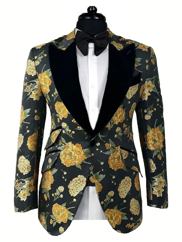 + Free Shipping| Product Name | Elegant and Stylish Custom Made Three Piece Peak Lapel Single Breasted Yellow Floral Jacquard Wedding and Prom Tuxedo |