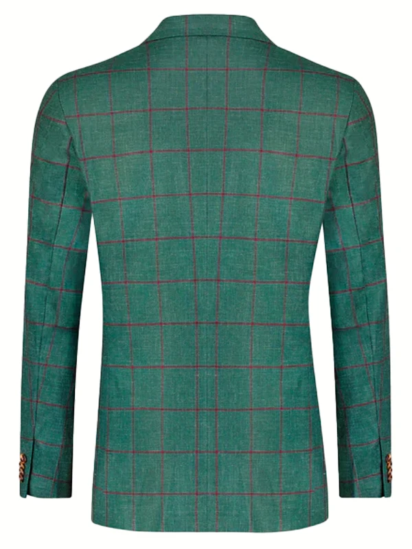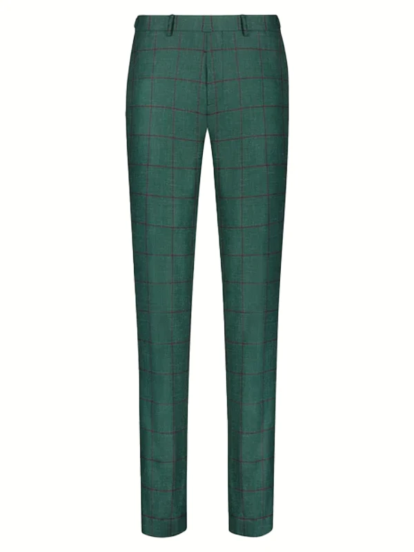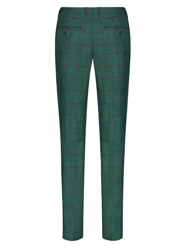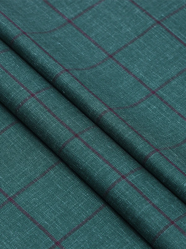 • This summer suit features a deep bottle green base adorned with an elegant claret windowpane check, creating a striking contrast that exudes a charm both retro and modern. The fabric, a blend of 80% Australian Wool, 15% Linen, and 5% Mulberry Silk, is soft against the skin, dry, and highly breathable. Lightweight yet structured, it ensures comfortable, non-clingy wear, perfectly balancing formality and casual ease for a touch of versatile elegance in summer settings.