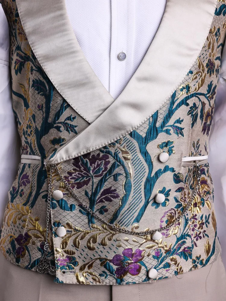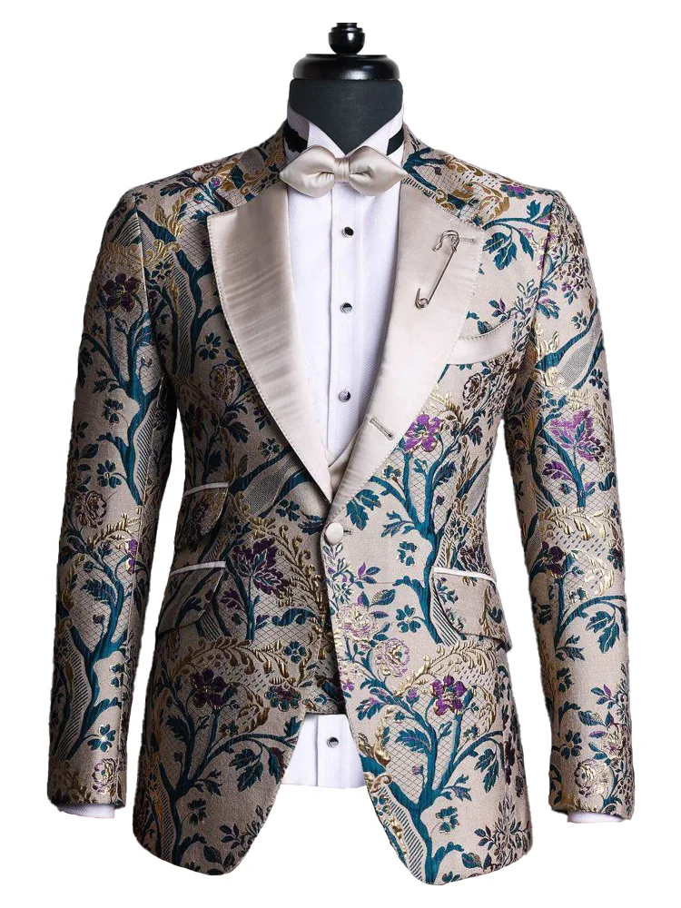 Elegant and Stylish Tailor Made Three Piece Notch Lapel Single Breasted Floral Jacquard Wedding and Prom Tuxedo
