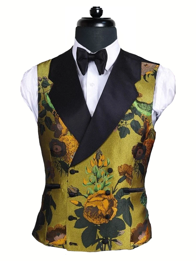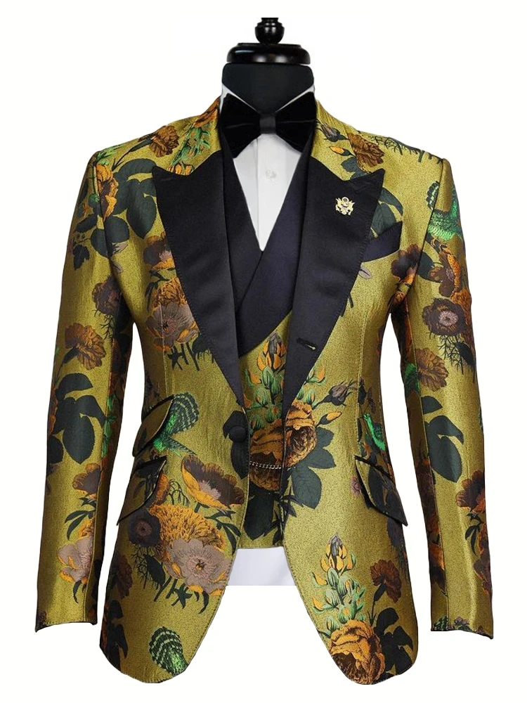 • The Floral and Bird Jacquard Tuxedo is crafted to elevate the modern gentleman’s sartorial presence. The intricate motif dances across an olive green backdrop, creating a striking visual statement far beyond ordinary formalwear. With its wide peak lapel exuding timeless elegance, this jacket ensures you command any formal occasion with confidence, making it perfect for fall and winter.