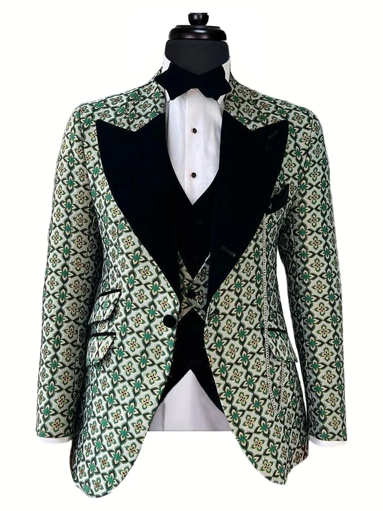 Fancy Custom Made Three Piece Shawl Lapel Single Breasted Green Star Jacquard Wedding and Prom Tuxedo