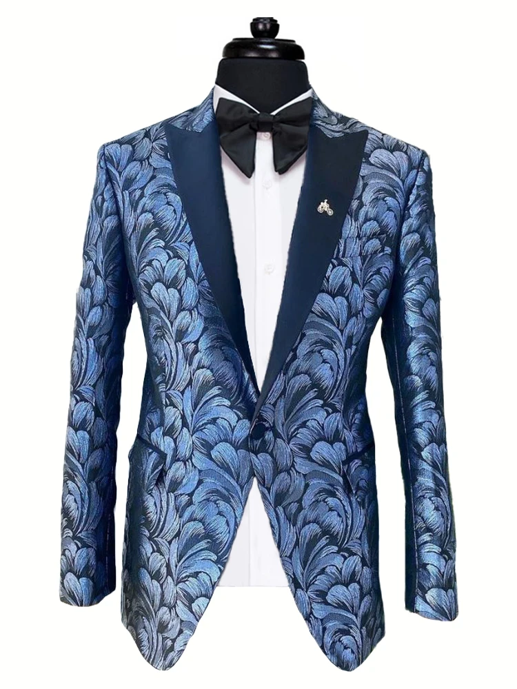 Fancy Custom Made Two Piece Peak Lapel Single Breasted Blue Floral Jacquard Wedding and Prom Tuxedo