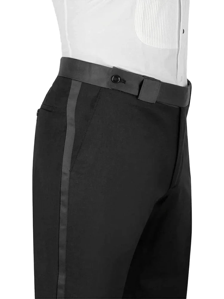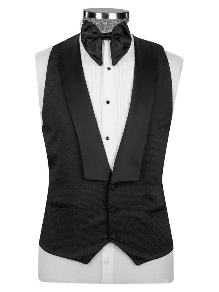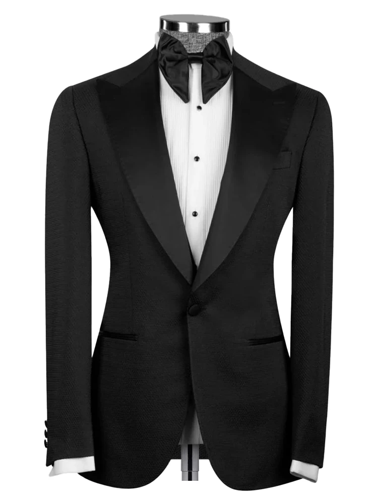 • Jacket: Satin Peak Lapel;2 Satin Jetted Pockets;Single One Button Closure; Double vent; Welted Chest Pocket; Waistcoat: Satin Shawl Lapel; 3 Buttons Closure; Satin Jetted Pocket; Trouser: Black Flat front; 2 Jetted Back Pockets; 2 Slant Front Pockets; Satin Waistband; Satin Side Stripe; One Button Extended; Zip Closure