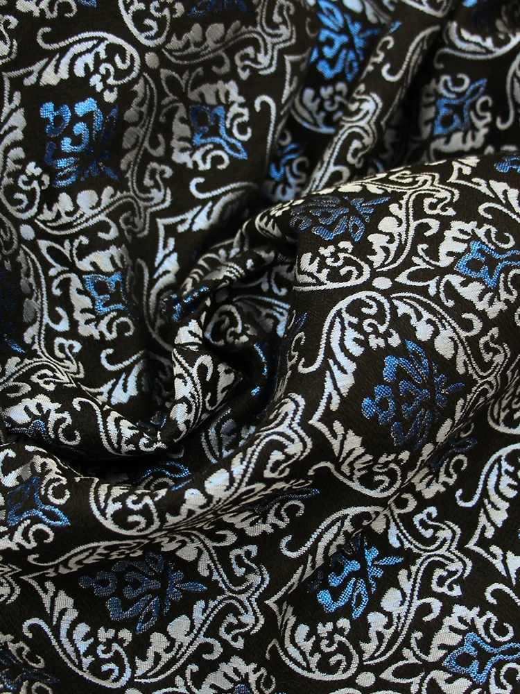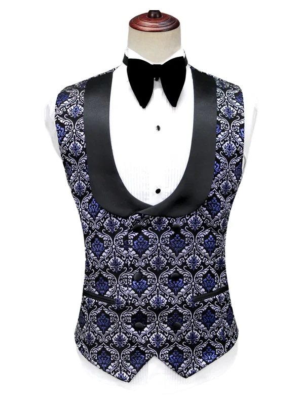 • This damask vintage blue tuxedo is a treat for the eyes and provides an even better fit. The double-breasted closure style of the suit accentuates the visual appeal in a regal manner. Get ready to turn some heads! Featuring a vintage damask pattern in deep blue and silver – it is striking to look at, while the peaked black lapels offer a flawless finishing touch.
