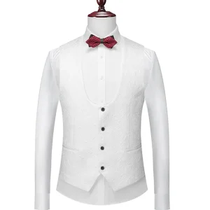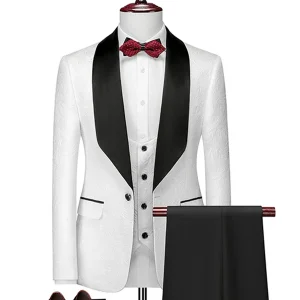 • Look Includes: Jacquard Weave; Jacket: Black Satin Shawl Lapel; Single Breasted One Button Closure; 2 Straight Flap Pockets; Center Vent. Pants: Belt Loops; Flat Front; One Button Extended Tab; Vest: None Lapel; Single Breasted 4 Button Closure; 2 Jetted Pockets.