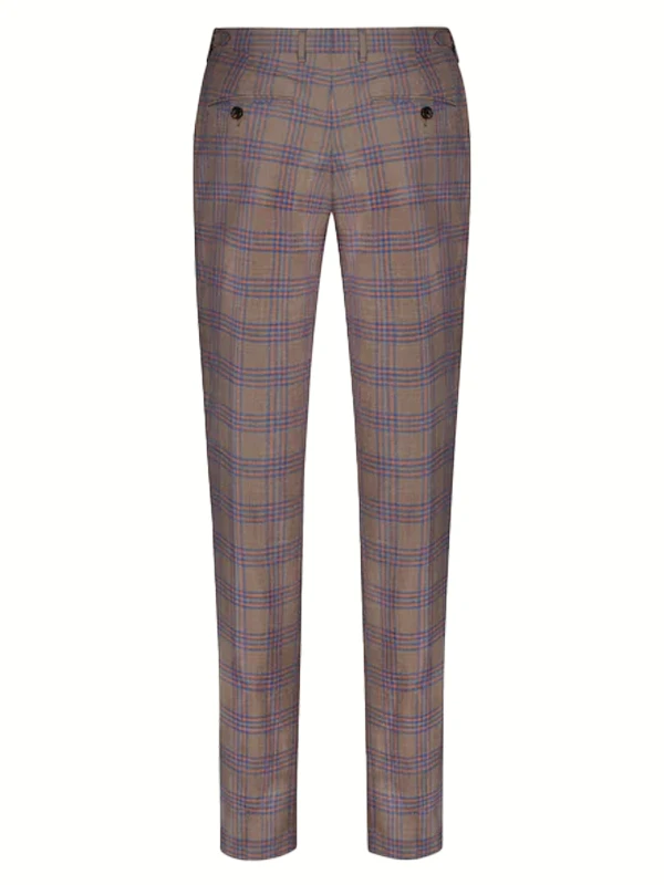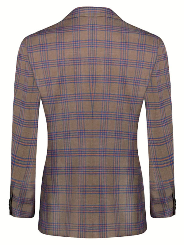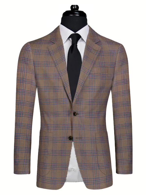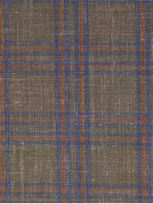 • This summer suit features a steady brown base accented with a vibrant orange check, creating a striking contrast that is both fashionable and dignified. The fabric, a blend of 80% Australian Wool, 15% Linen, and 5% Mulberry Silk, is soft against the skin, dry, and highly breathable. Lightweight yet structured, it ensures comfortable, non-clingy wear, perfectly balancing formality and leisure. It is the discerning choice for both business and social occasions in summer.
