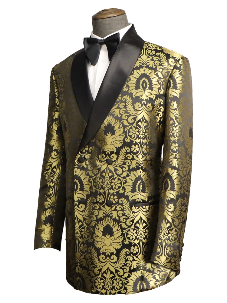 + Free ShippingProduct Name | Modern and Exotic Custom Made Shawl Lapel Double Breasted Black Gold Jacquard Wedding and Prom Tuxedo |