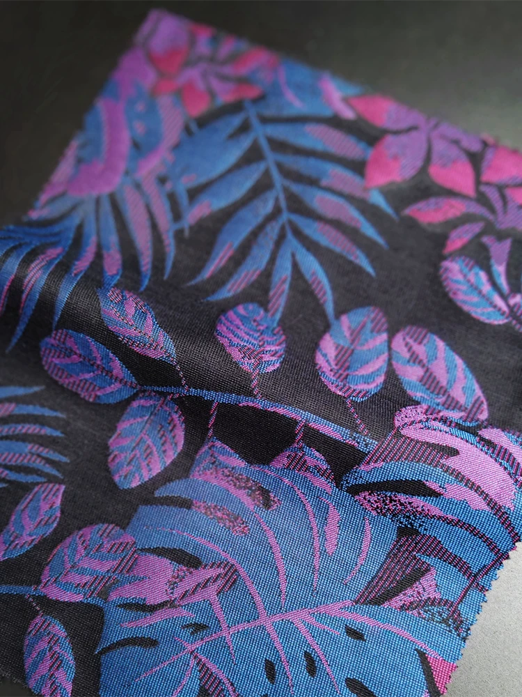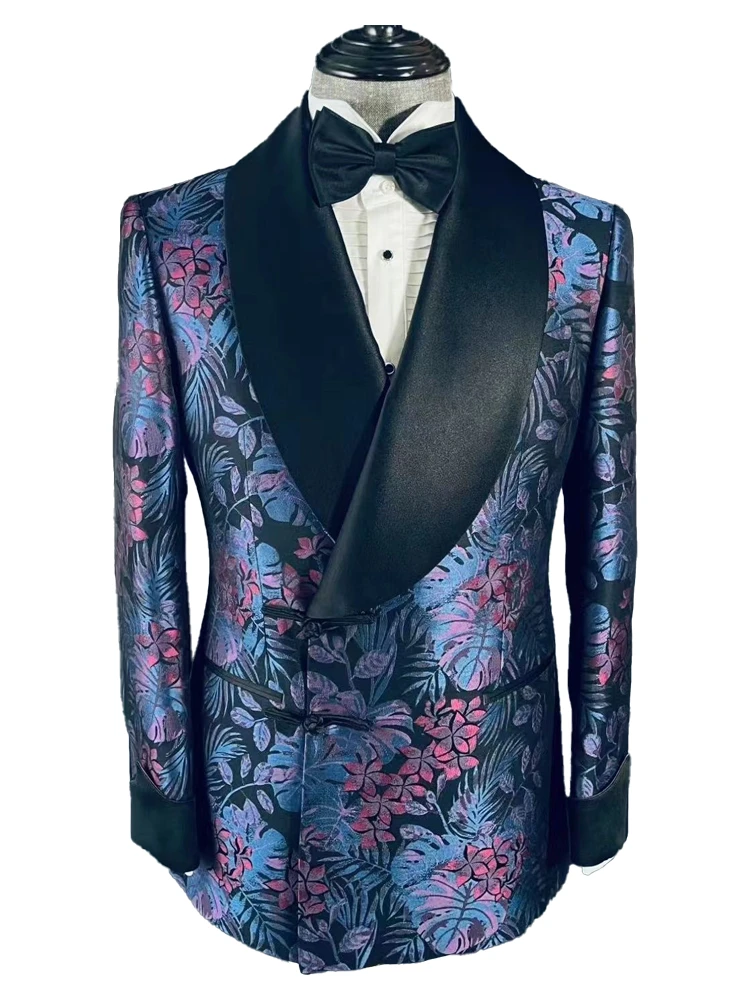 • Make an unforgettable entrance with the Nocturnal Bloom Jacquard Tuxedo—a statement piece designed for those who embrace bold sophistication. The rich floral jacquard pattern in deep purples and electric blues creates a striking contrast against a black base.