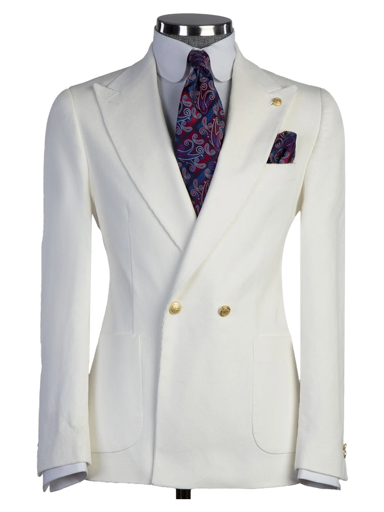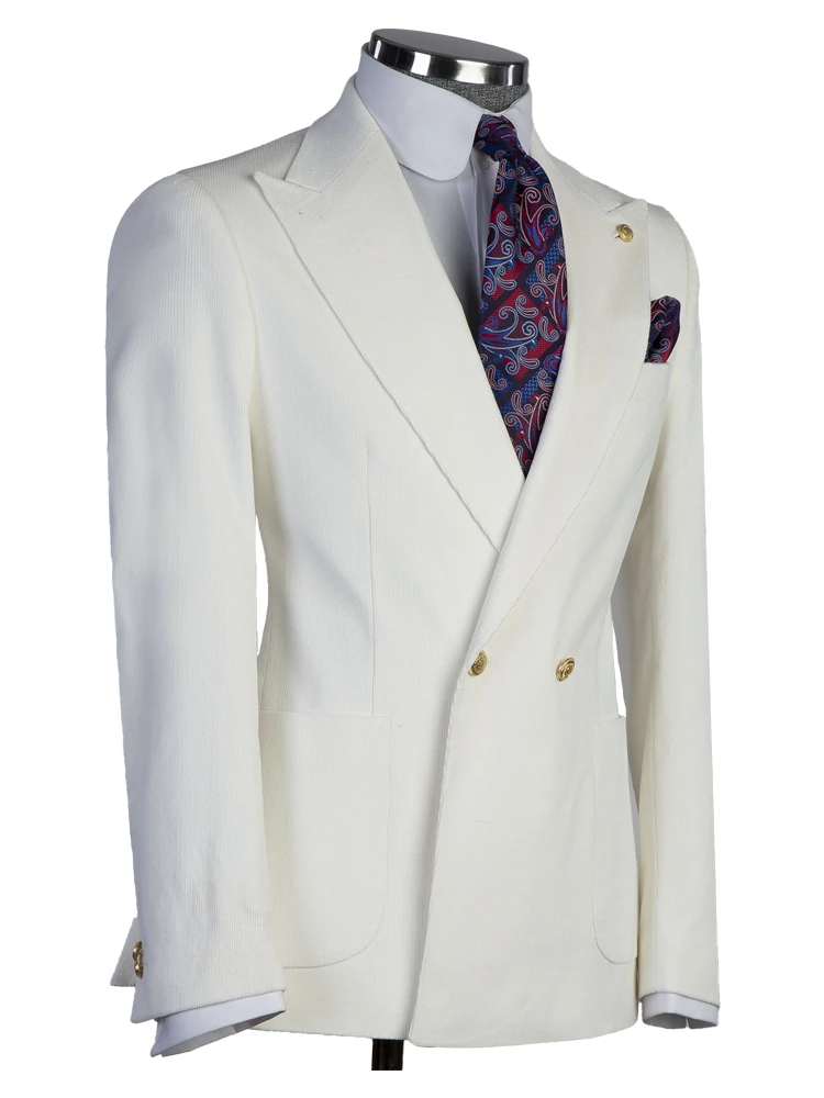New Arrival Elegant and Fashion Custom Two Piece Peak Lapel Double Breasted White Corduroy Prom and Wedding Men Suits