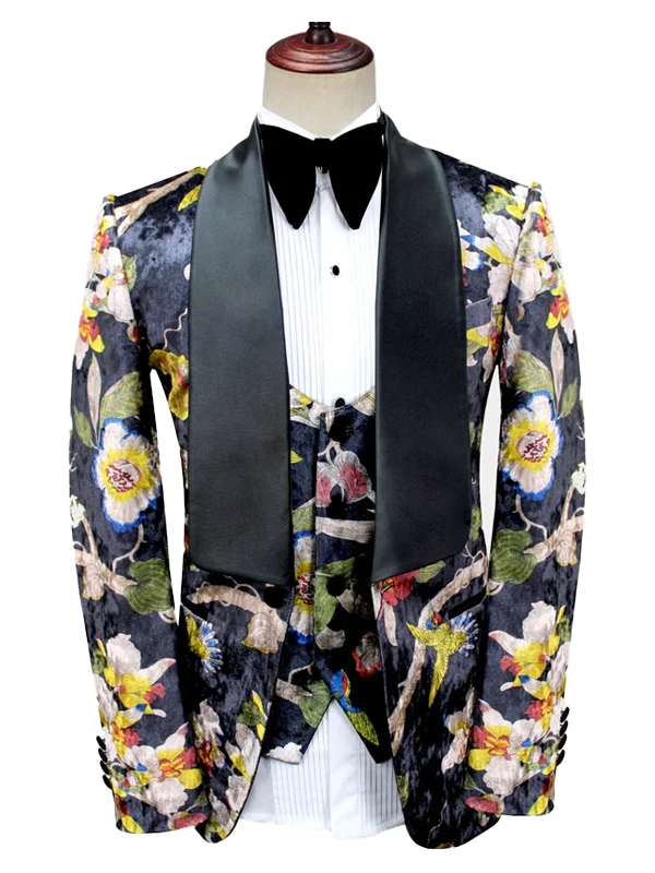 + Free Shipping| Product Name | Vintage and Elegant Tailor Made Three Piece Shawl Lapel Single Breasted Orchid Floral Velvet Wedding and Prom Men Tuxedos |